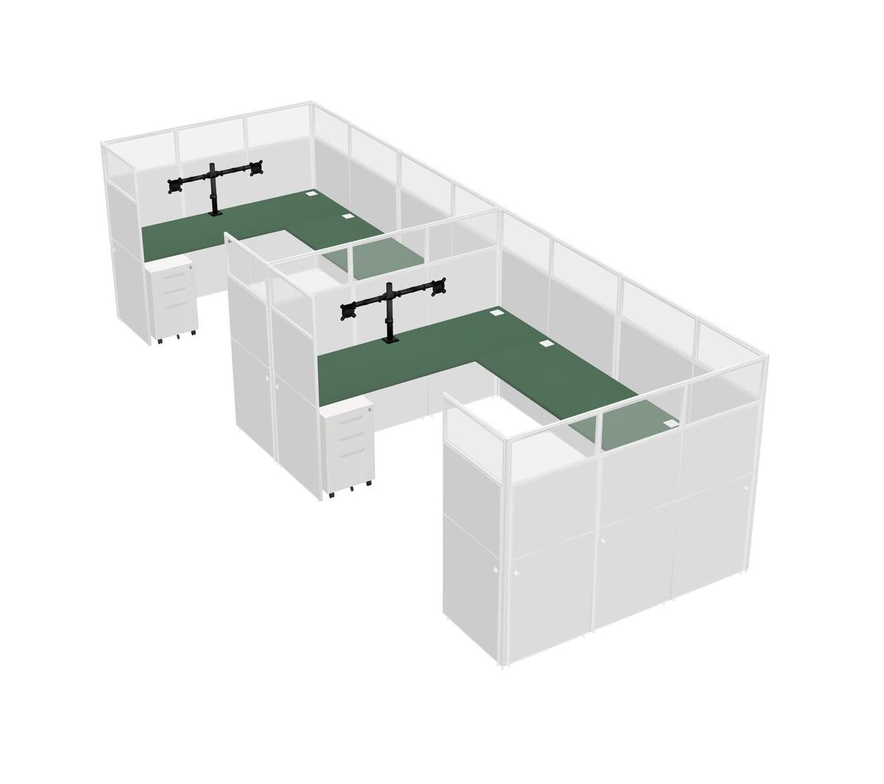 Green U-shaped Panel System For 2 Person + Monitor Arm (double Arms) + Metal Mobile Drawers For 2 User(s)