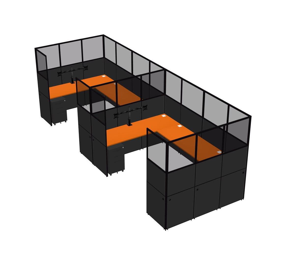 Orange U-shaped Panel System For 2 Person + Monitor Arm (double Arms) + Metal Mobile Drawers For 2 User(s)