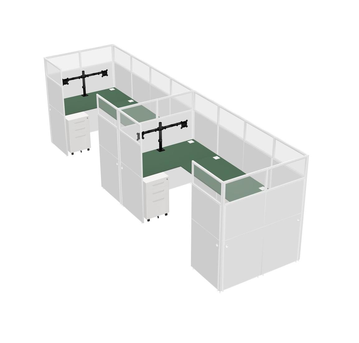 Green U-shaped Panel System For 2 Person + Monitor Arm (double Arms) + Metal Mobile Drawers For 2 User(s)