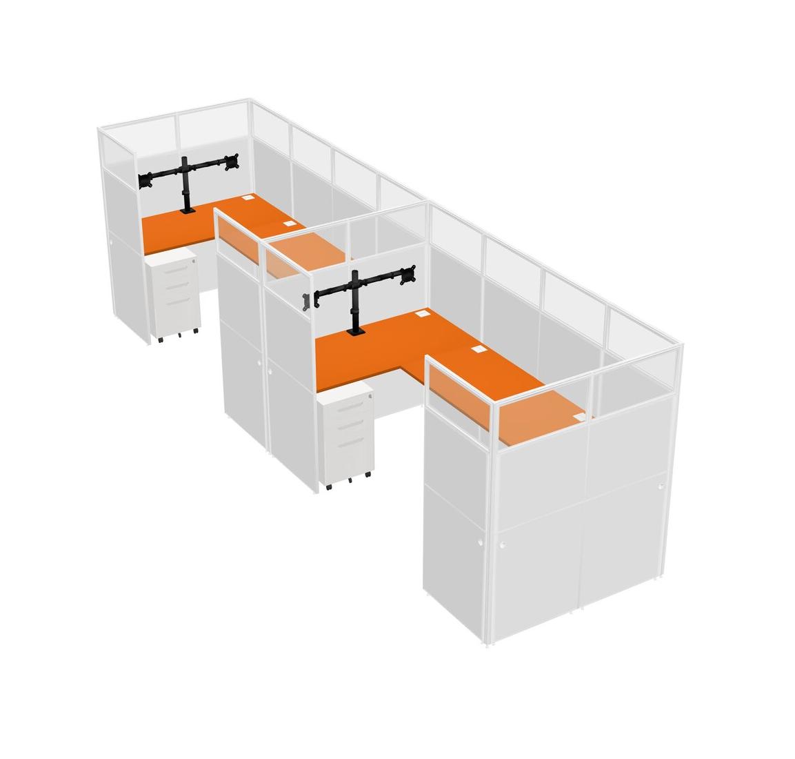 Orange U-shaped Panel System For 2 Person + Monitor Arm (double Arms) + Metal Mobile Drawers For 2 User(s)