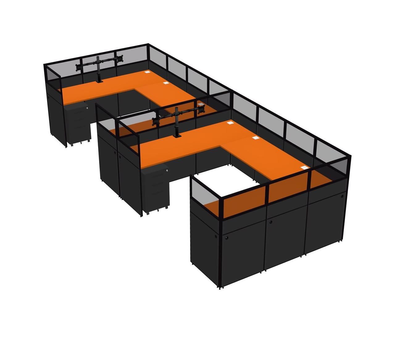 Orange U-shaped Panel System For 2 Person + Monitor Arm (double Arms) + Metal Mobile Drawers For 2 User(s)