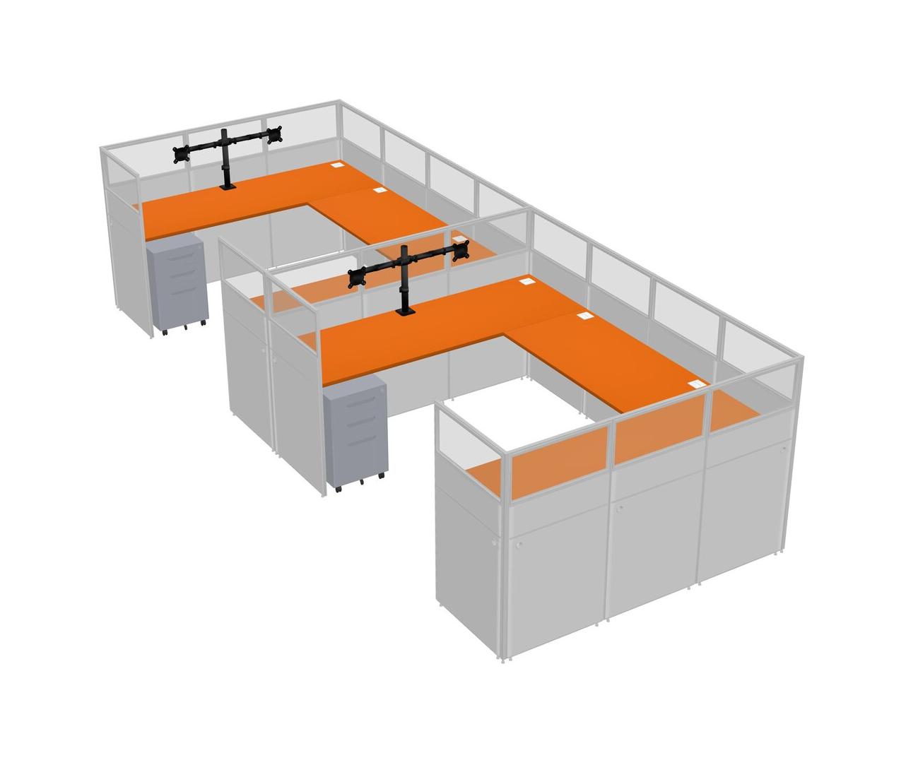 Orange U-shaped Panel System For 2 Person + Monitor Arm (double Arms) + Metal Mobile Drawers For 2 User(s)