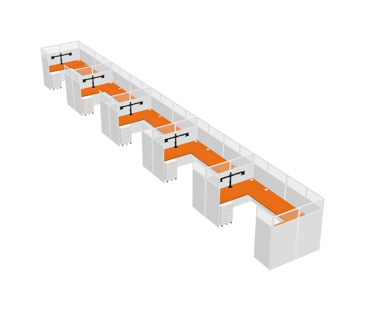 Orange U-shaped Panel System For 5 Person + Monitor Arm (double Arms) + Metal Mobile Drawers For 5 User(s)