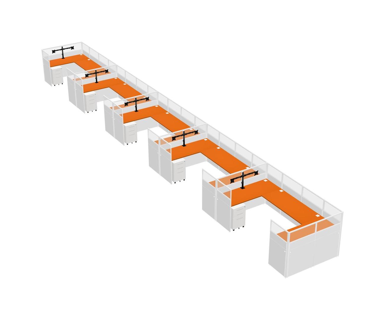 Orange U-shaped Panel System For 5 Person + Monitor Arm (double Arms) + Metal Mobile Drawers For 5 User(s)