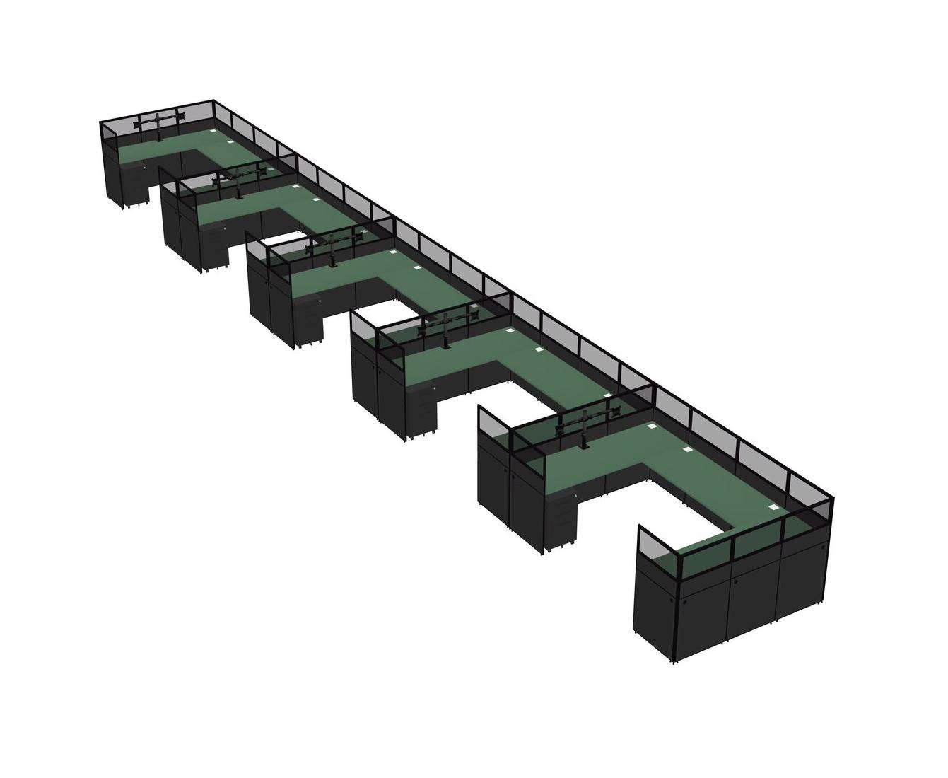 Green U-shaped Panel System For 5 Person + Monitor Arm (double Arms) + Metal Mobile Drawers For 5 User(s)