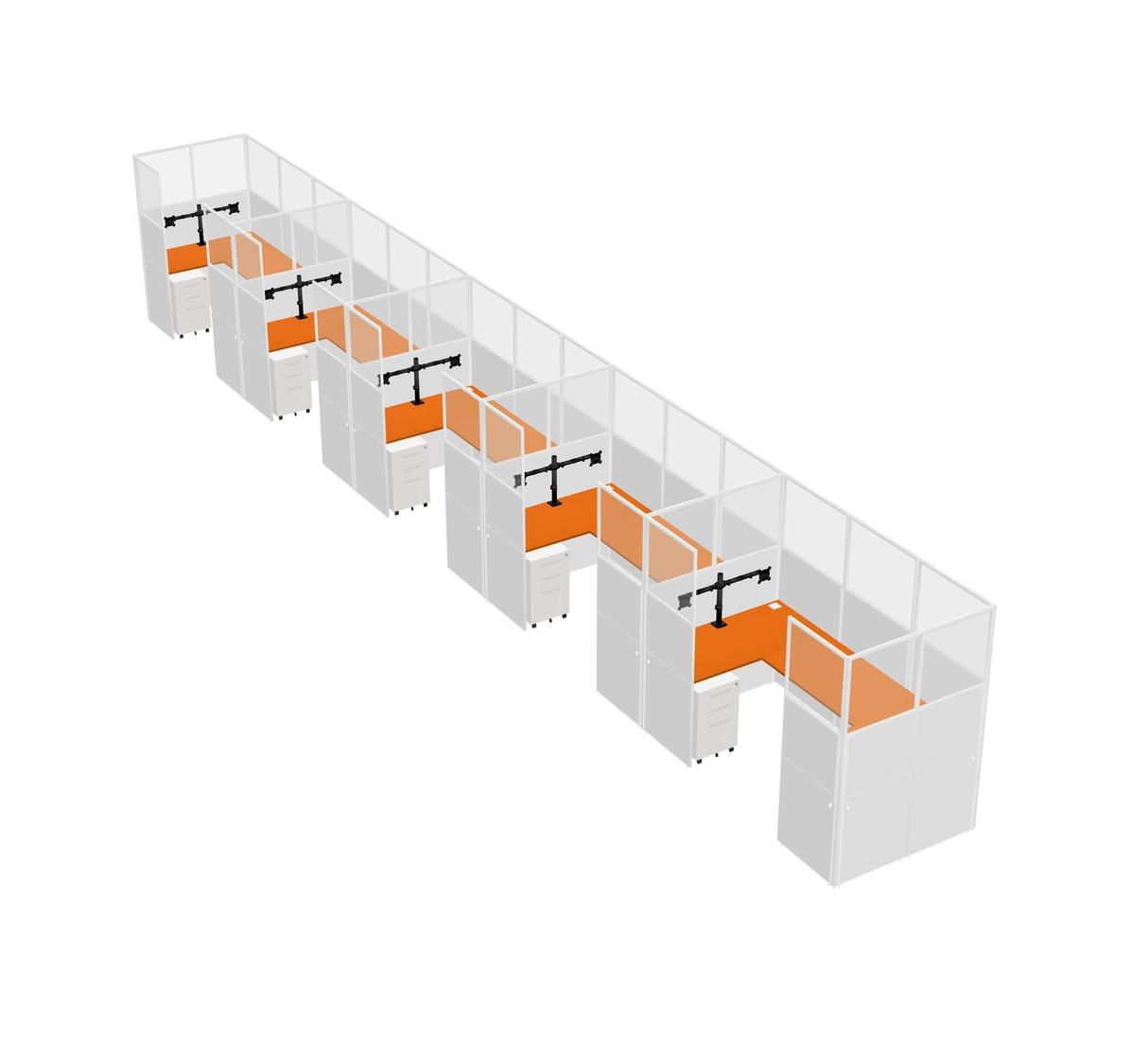 Orange U-shaped Panel System For 5 Person + Monitor Arm (double Arms) + Metal Mobile Drawers For 5 User(s)