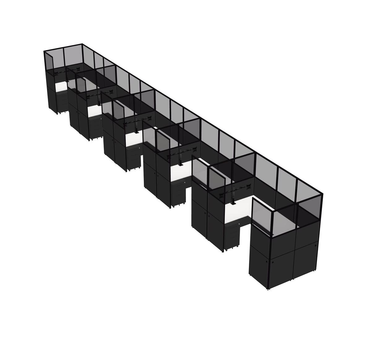 White U-shaped Panel System For 5 Person + Monitor Arm (double Arms) + Metal Mobile Drawers For 5 User(s)