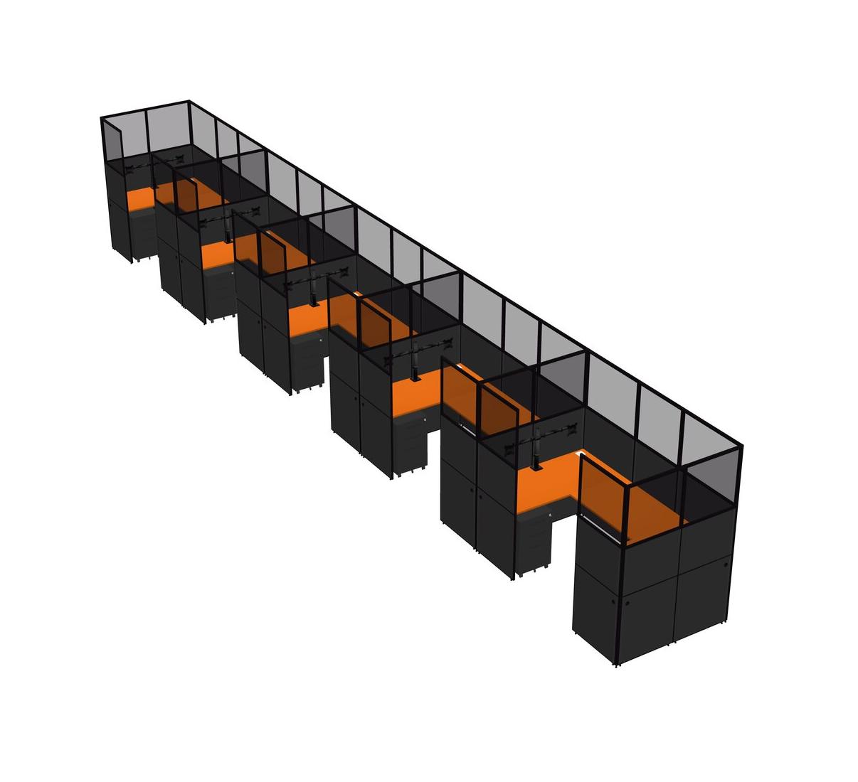 Orange U-shaped Panel System For 5 Person + Monitor Arm (double Arms) + Metal Mobile Drawers For 5 User(s)