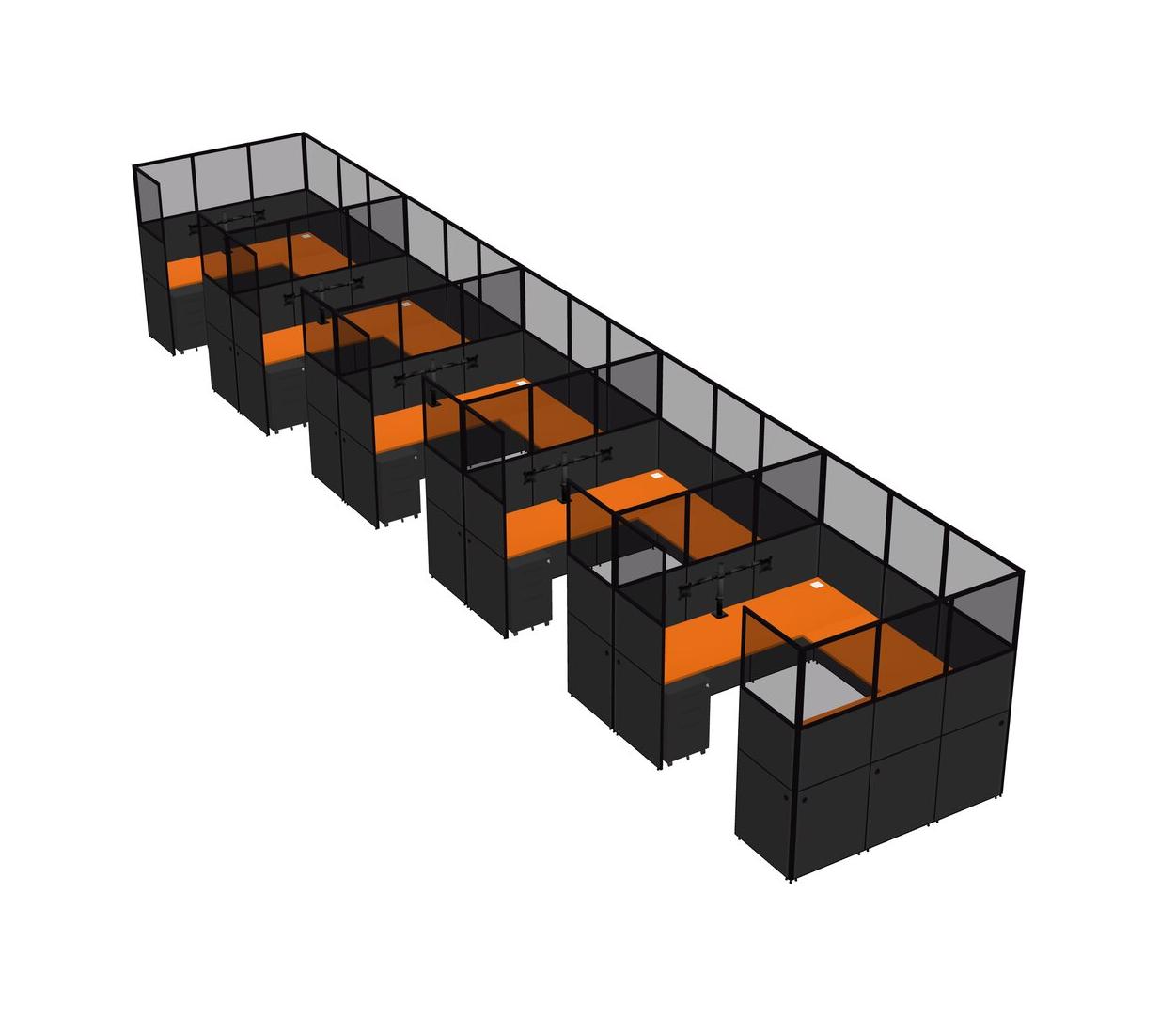 Orange U-shaped Panel System For 5 Person + Monitor Arm (double Arms) + Metal Mobile Drawers For 5 User(s)