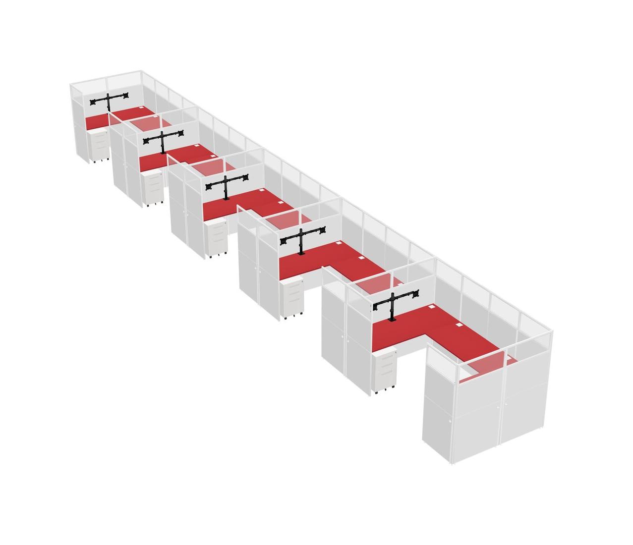 Prism Red U-shaped Panel System For 5 Person + Monitor Arm (double Arms) + Metal Mobile Drawers For 5 User(s)