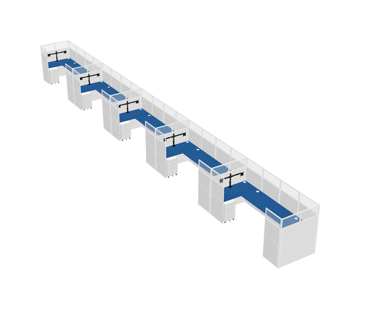 Prism Blue U-shaped Panel System For 5 Person + Monitor Arm (double Arms) + Metal Mobile Drawers For 5 User(s)