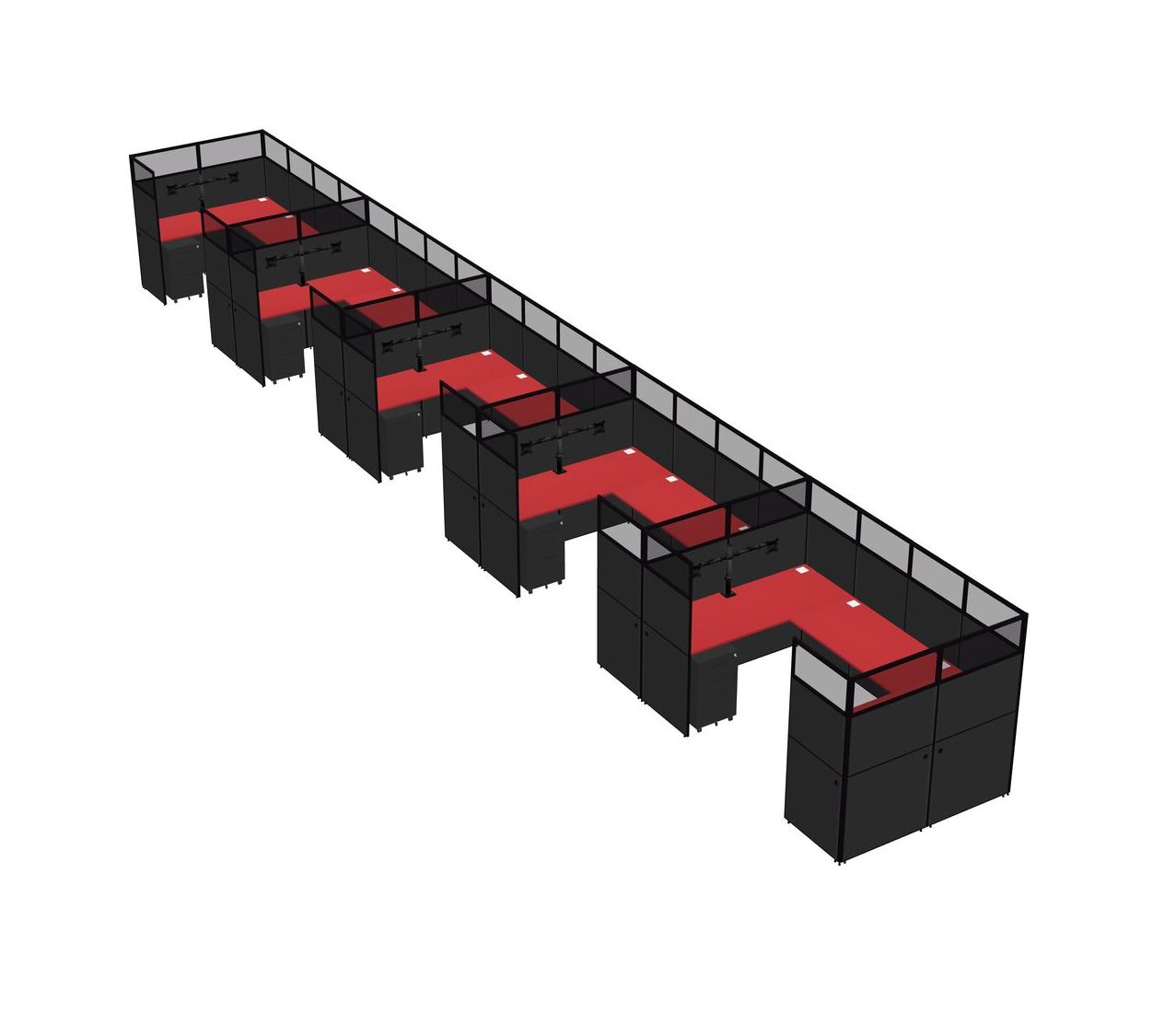 Prism Red U-shaped Panel System For 5 Person + Monitor Arm (double Arms) + Metal Mobile Drawers For 5 User(s)