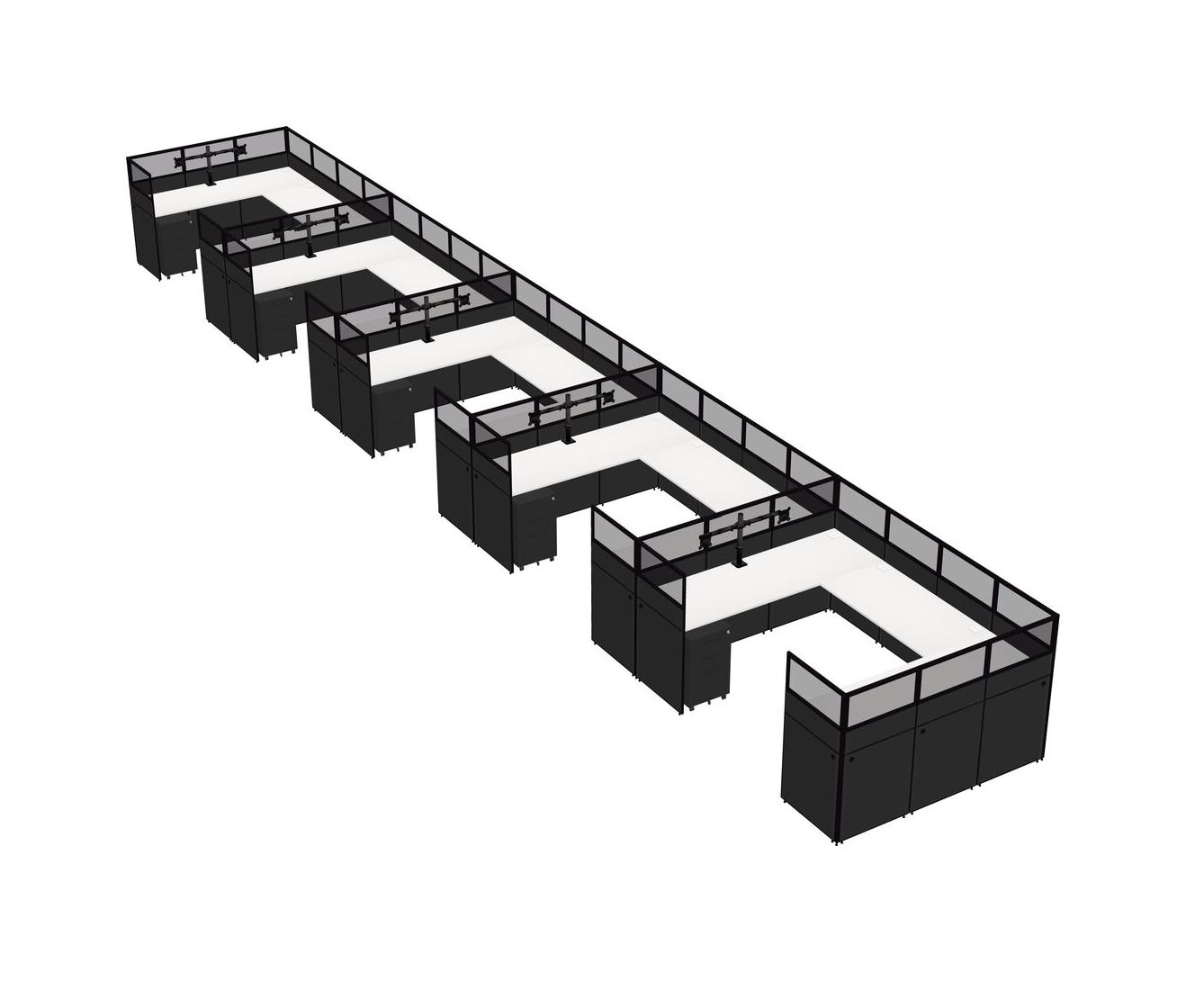 White U-shaped Panel System For 5 Person + Monitor Arm (double Arms) + Metal Mobile Drawers For 5 User(s)
