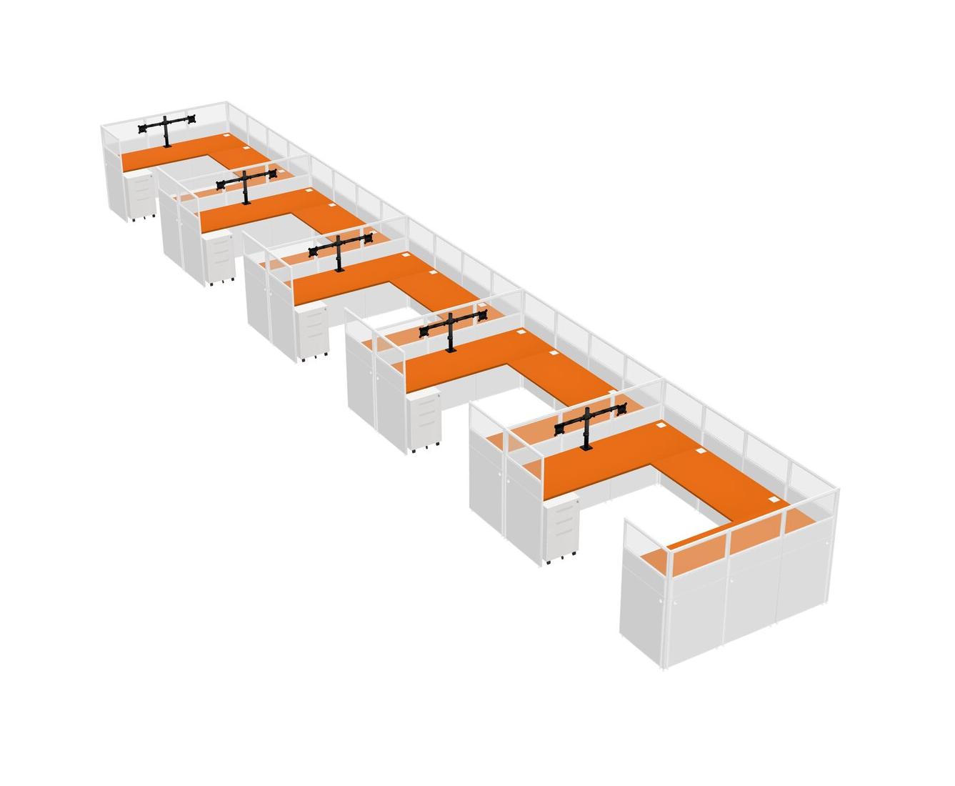 Orange U-shaped Panel System For 5 Person + Monitor Arm (double Arms) + Metal Mobile Drawers For 5 User(s)