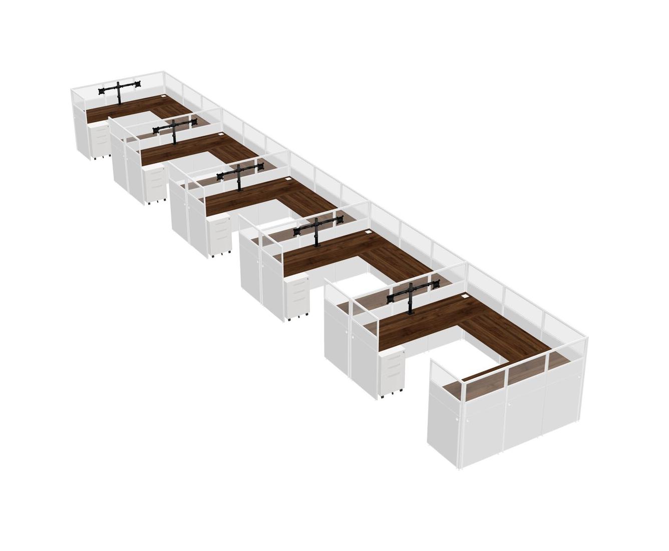Columbia Walnut U-shaped Panel System For 5 Person + Monitor Arm (double Arms) + Metal Mobile Drawers For 5 User(s)