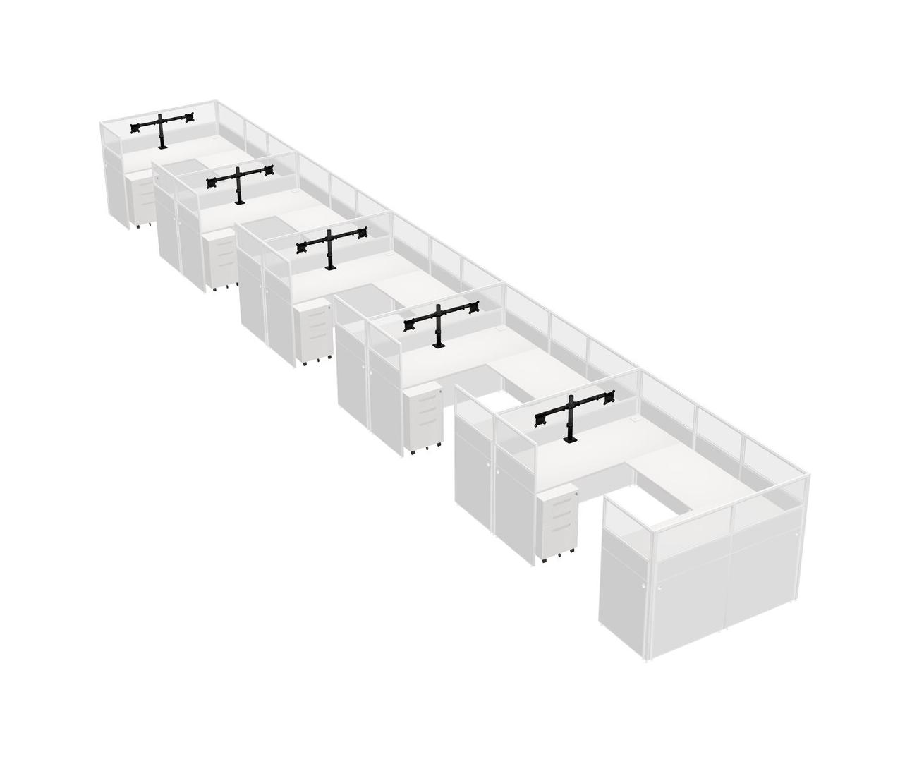 White U-shaped Panel System For 5 Person + Monitor Arm (double Arms) + Metal Mobile Drawers For 5 User(s)
