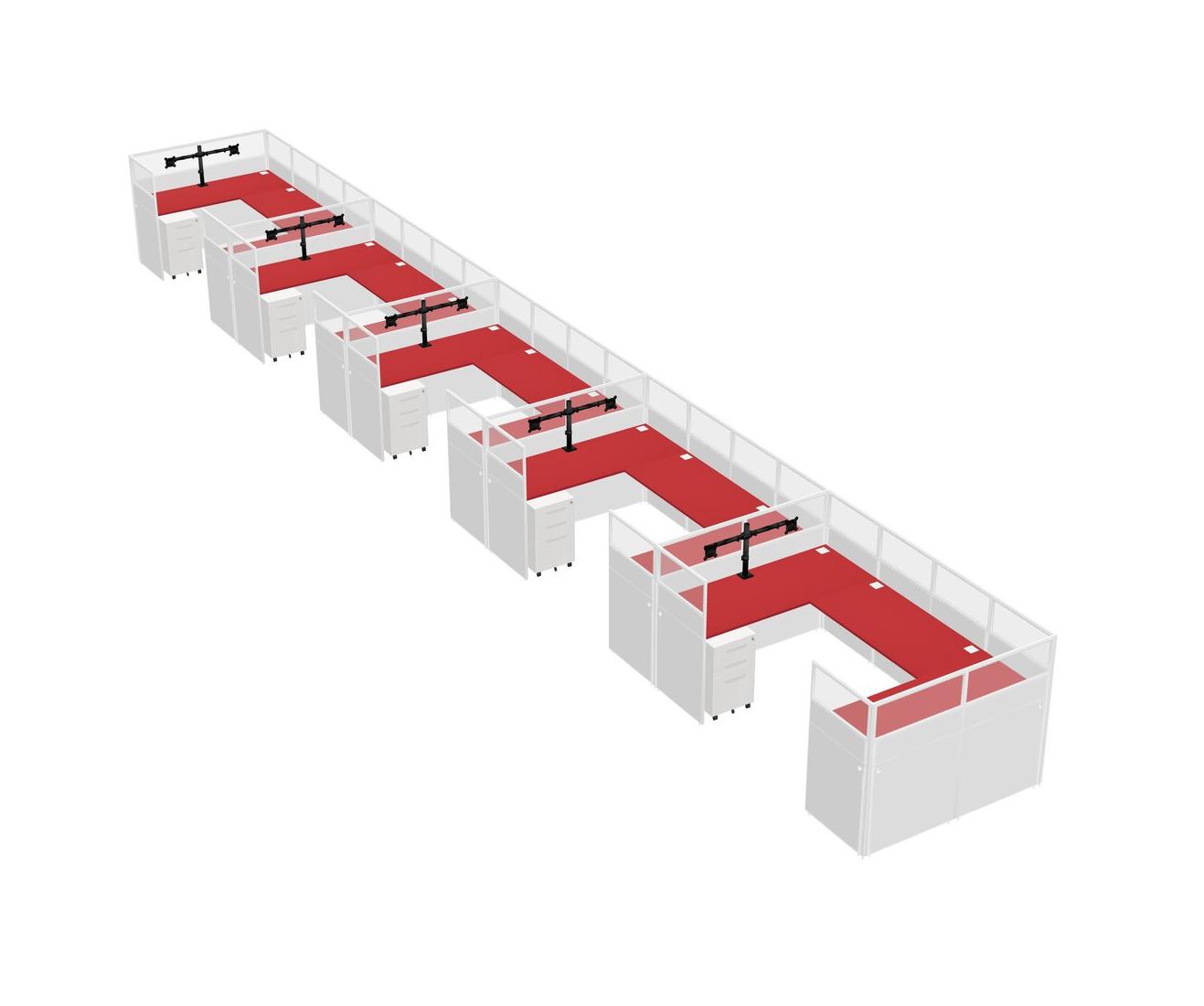 Prism Red U-shaped Panel System For 5 Person + Monitor Arm (double Arms) + Metal Mobile Drawers For 5 User(s)