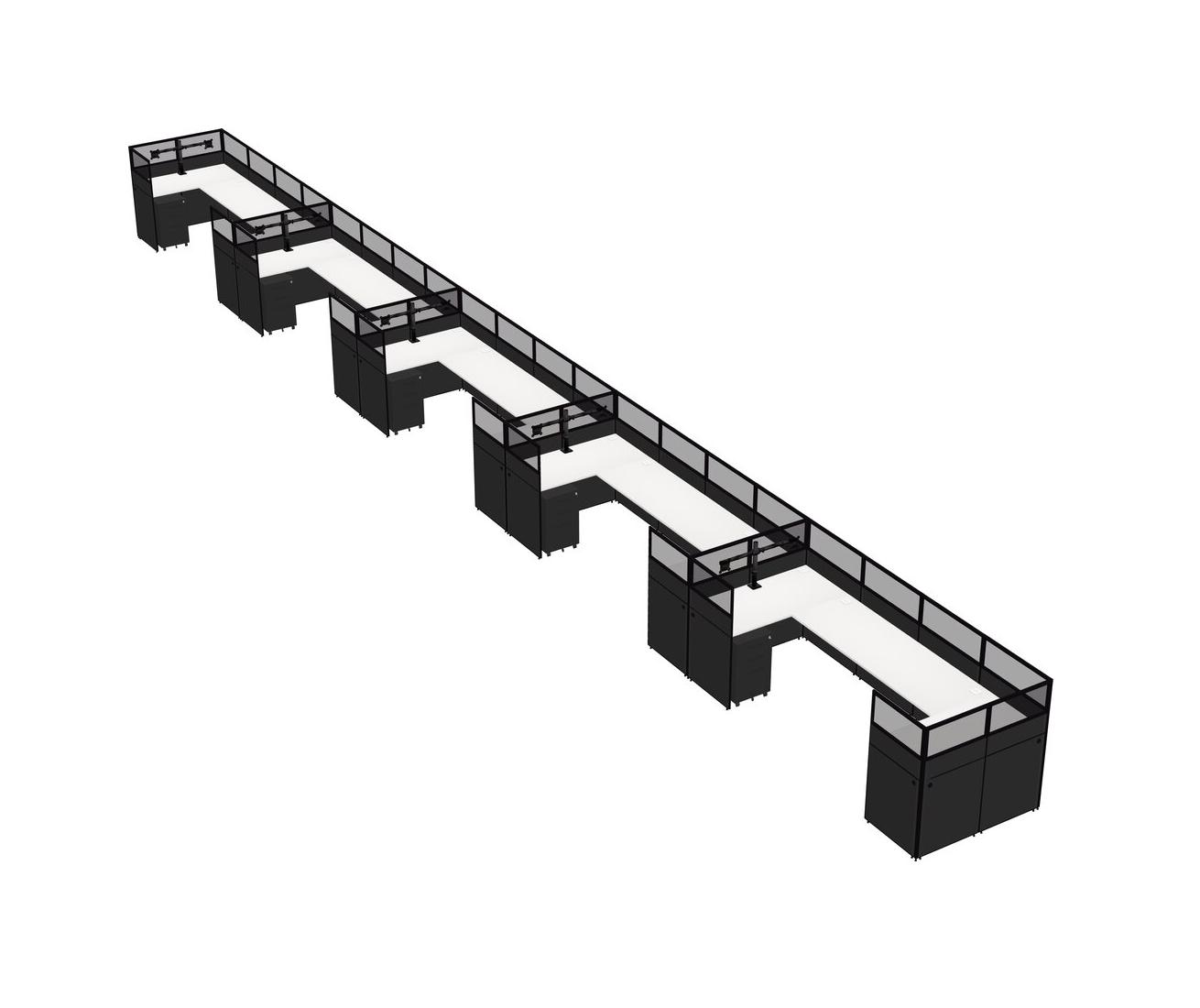 White U-shaped Panel System For 5 Person + Monitor Arm (double Arms) + Metal Mobile Drawers For 5 User(s)