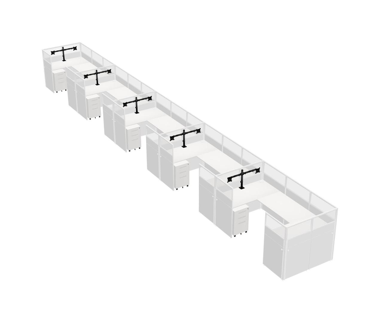 White U-shaped Panel System For 5 Person + Monitor Arm (double Arms) + Metal Mobile Drawers For 5 User(s)