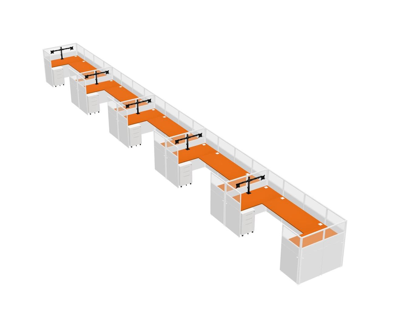 Orange U-shaped Panel System For 5 Person + Monitor Arm (double Arms) + Metal Mobile Drawers For 5 User(s)