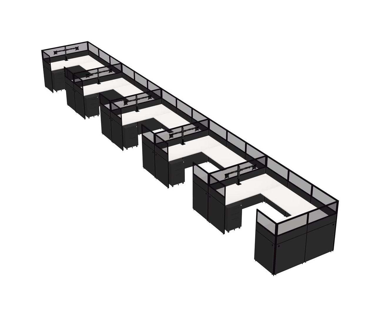 White U-shaped Panel System For 5 Person + Monitor Arm (double Arms) + Metal Mobile Drawers For 5 User(s)