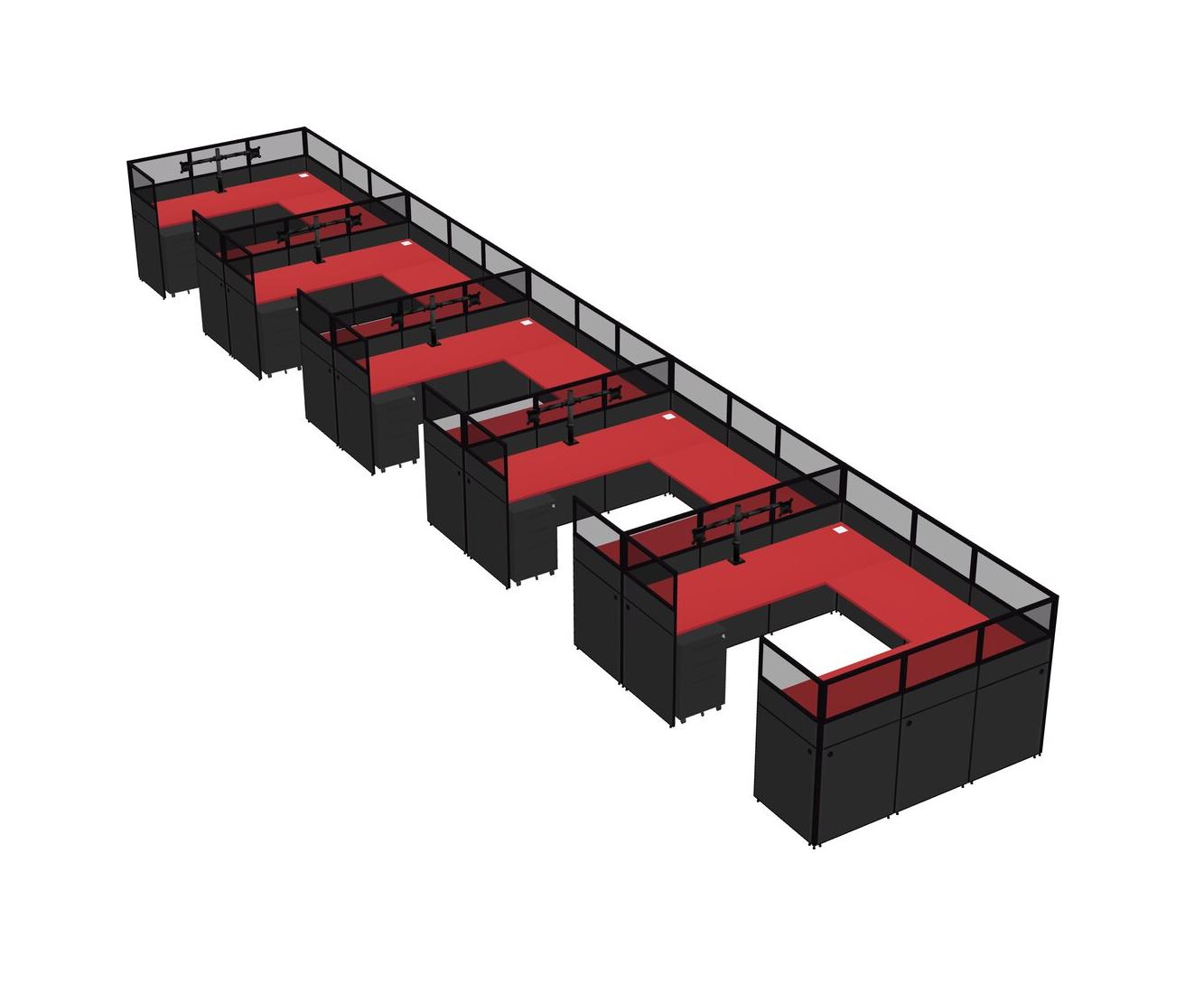 Prism Red U-shaped Panel System For 5 Person + Monitor Arm (double Arms) + Metal Mobile Drawers For 5 User(s)
