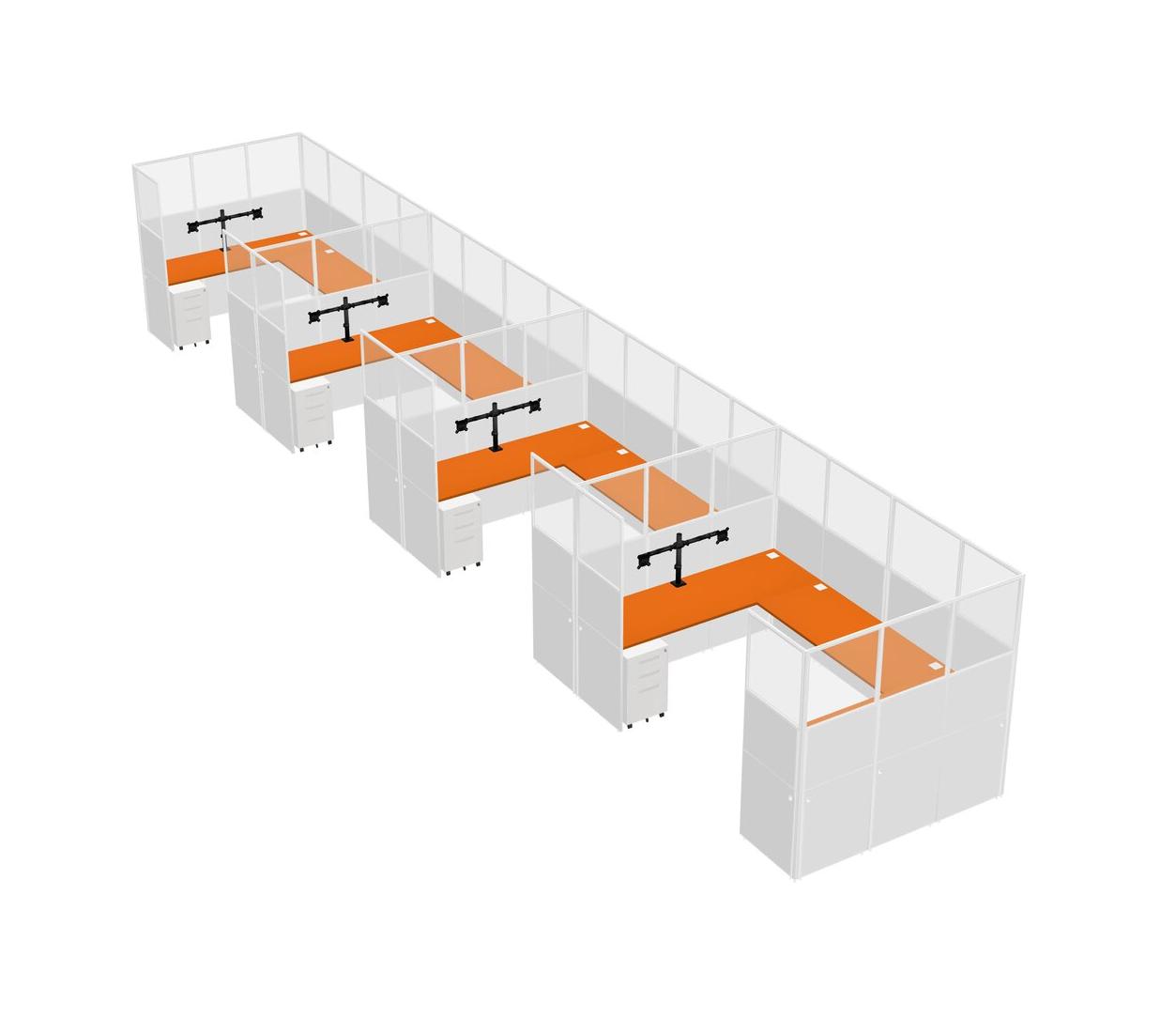 Orange U-shaped Panel System For 4 Person + Monitor Arm (double Arms) + Metal Mobile Drawers For 4 User(s)