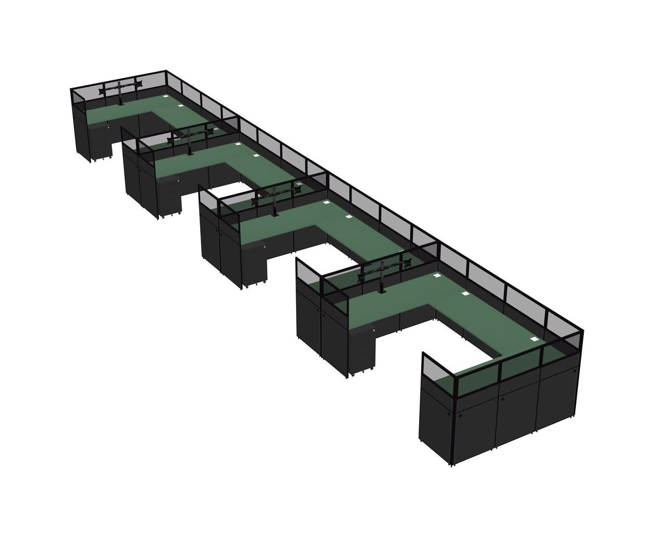 Green U-shaped Panel System For 4 Person + Monitor Arm (double Arms) + Metal Mobile Drawers For 4 User(s)