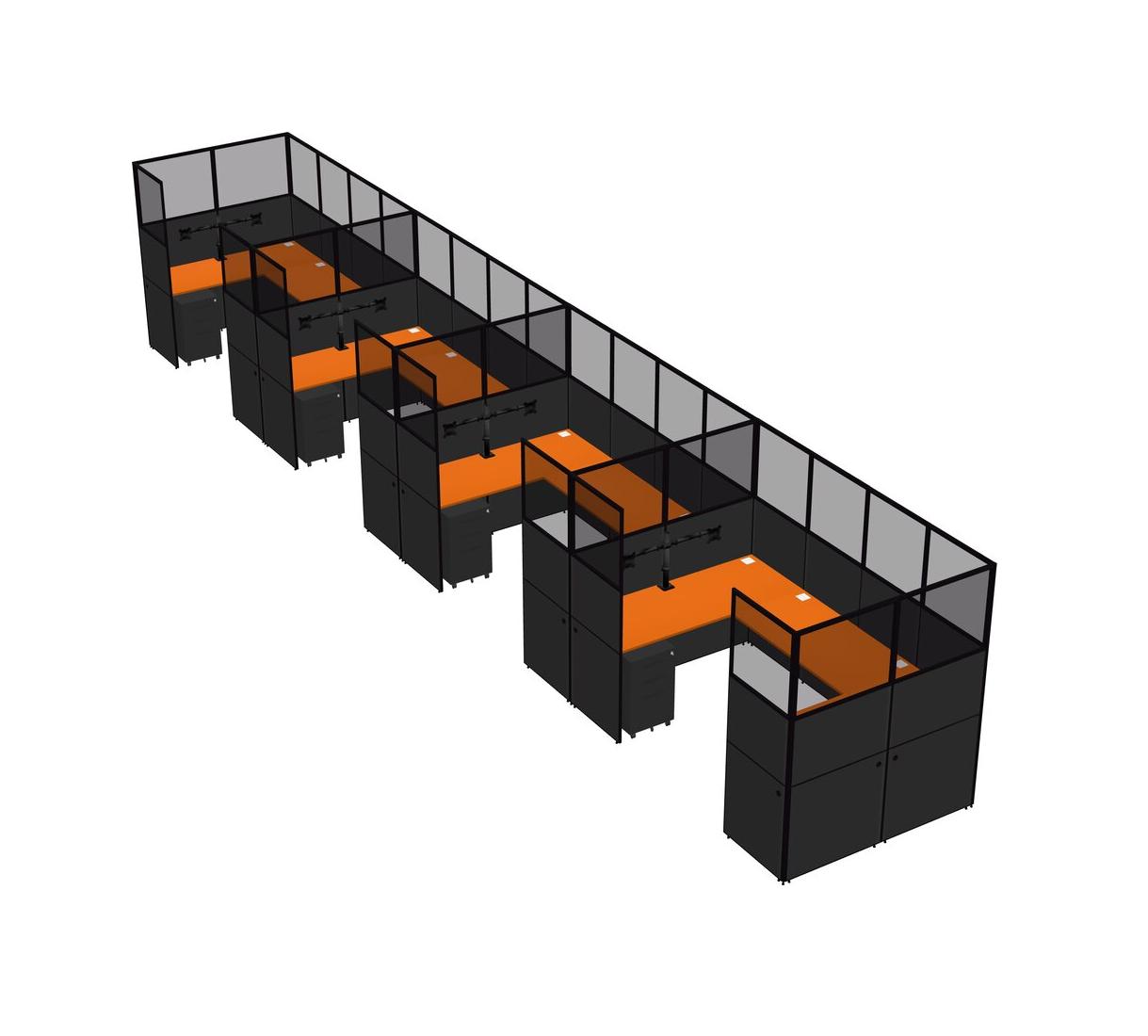 Orange U-shaped Panel System For 4 Person + Monitor Arm (double Arms) + Metal Mobile Drawers For 4 User(s)