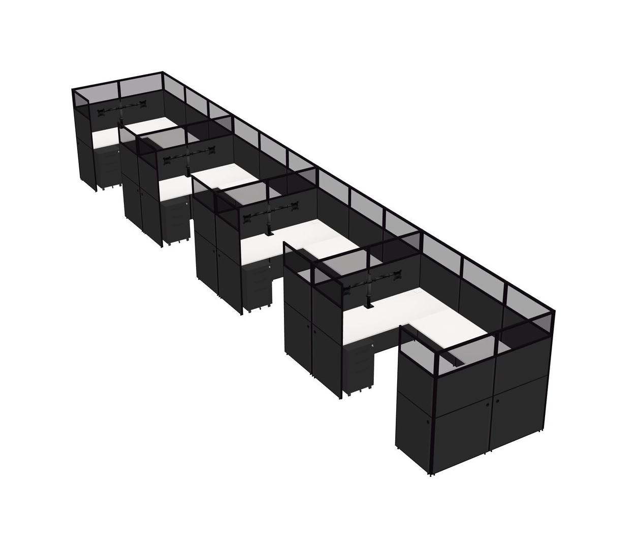 White U-shaped Panel System For 4 Person + Monitor Arm (double Arms) + Metal Mobile Drawers For 4 User(s)