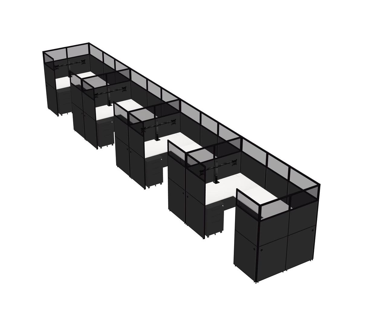 White U-shaped Panel System For 4 Person + Monitor Arm (double Arms) + Metal Mobile Drawers For 4 User(s)