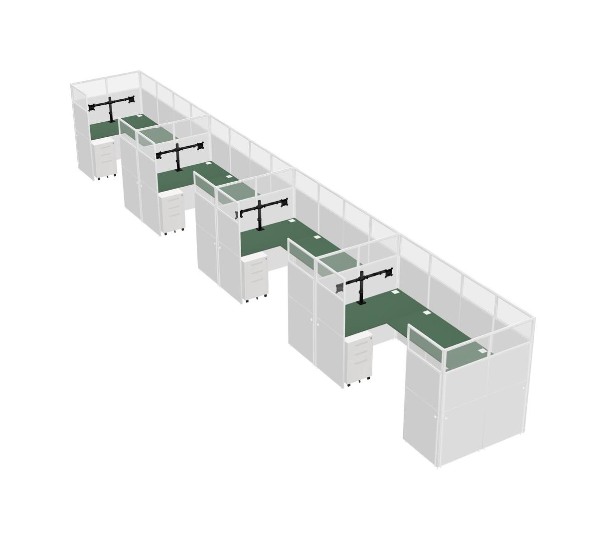 Green U-shaped Panel System For 4 Person + Monitor Arm (double Arms) + Metal Mobile Drawers For 4 User(s)