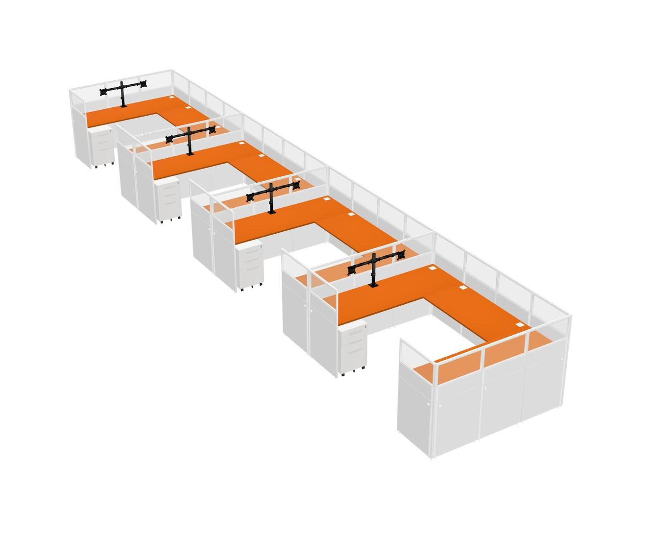 Orange U-shaped Panel System For 4 Person + Monitor Arm (double Arms) + Metal Mobile Drawers For 4 User(s)