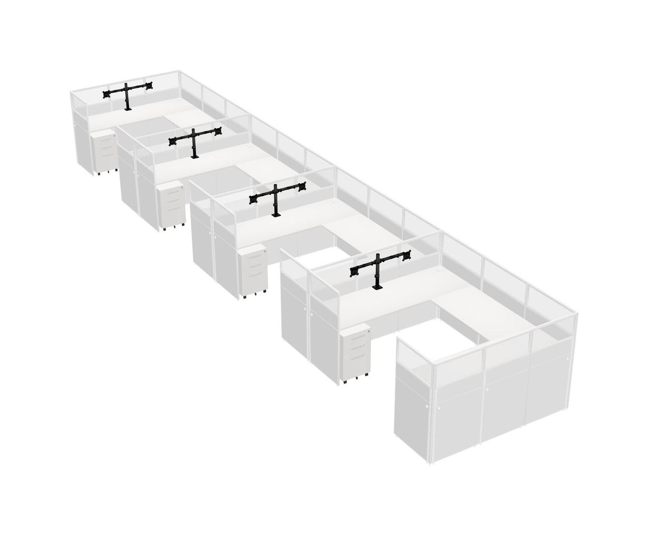 White U-shaped Panel System For 4 Person + Monitor Arm (double Arms) + Metal Mobile Drawers For 4 User(s)
