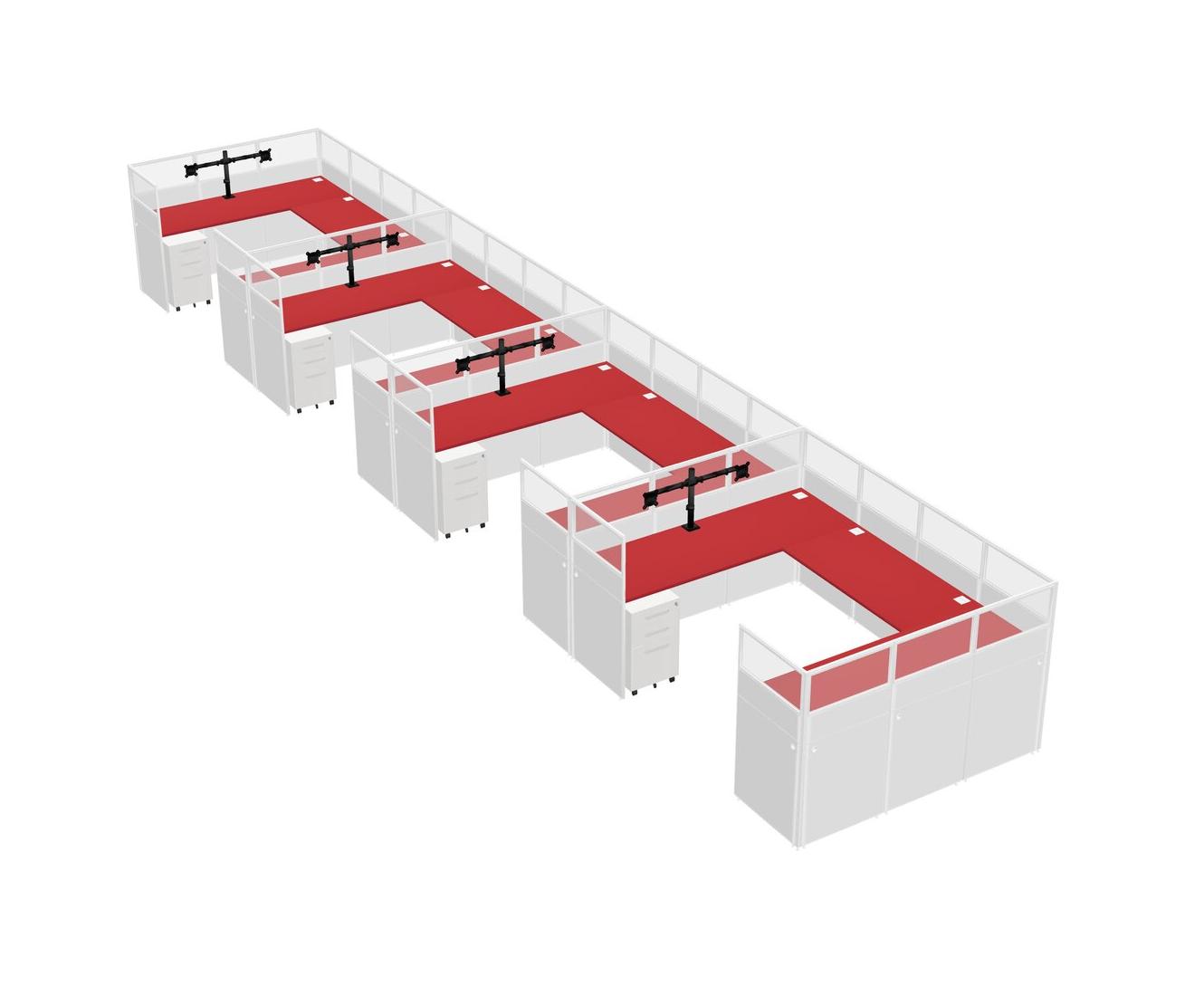 Prism Red U-shaped Panel System For 4 Person + Monitor Arm (double Arms) + Metal Mobile Drawers For 4 User(s)