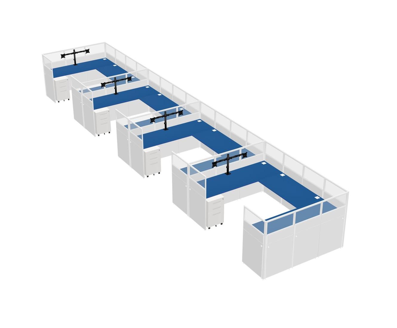 Prism Blue U-shaped Panel System For 4 Person + Monitor Arm (double Arms) + Metal Mobile Drawers For 4 User(s)