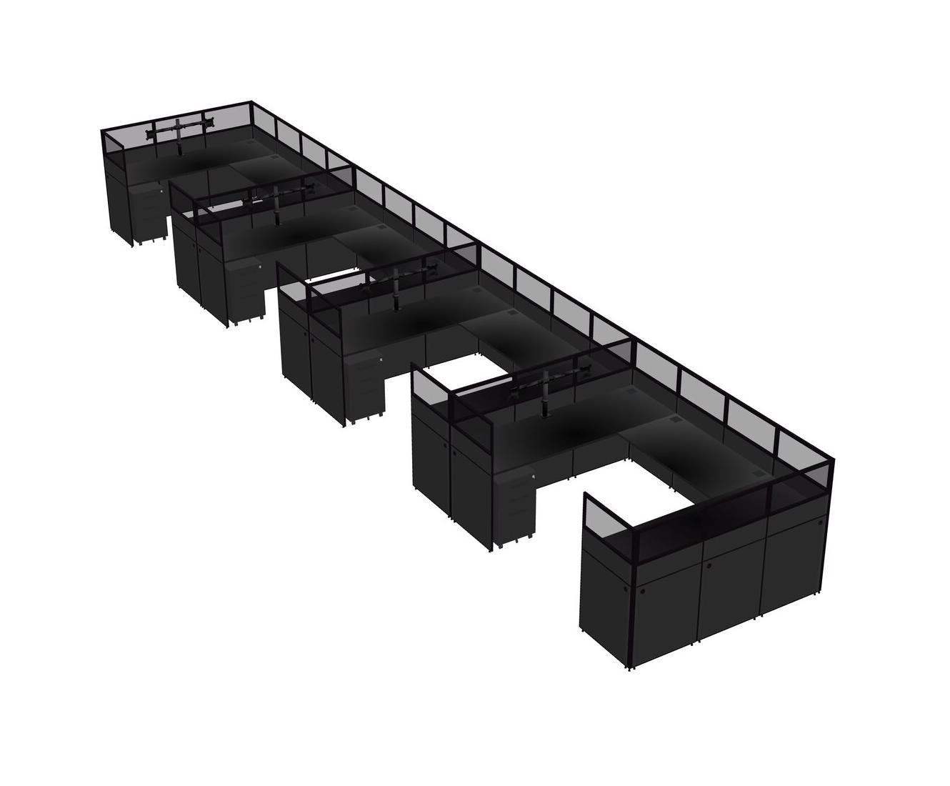 Black U-shaped Panel System For 4 Person + Monitor Arm (double Arms) + Metal Mobile Drawers For 4 User(s)
