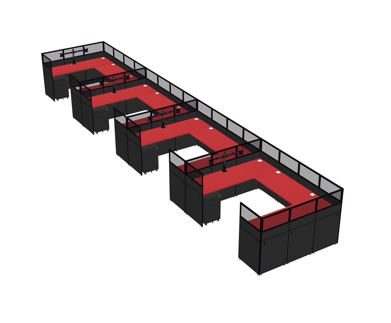 Prism Red U-shaped Panel System For 4 Person + Monitor Arm (double Arms) + Metal Mobile Drawers For 4 User(s)