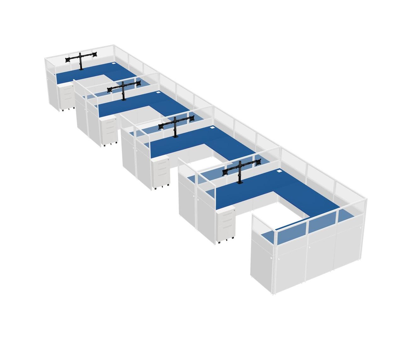 Prism Blue U-shaped Panel System For 4 Person + Monitor Arm (double Arms) + Metal Mobile Drawers For 4 User(s)
