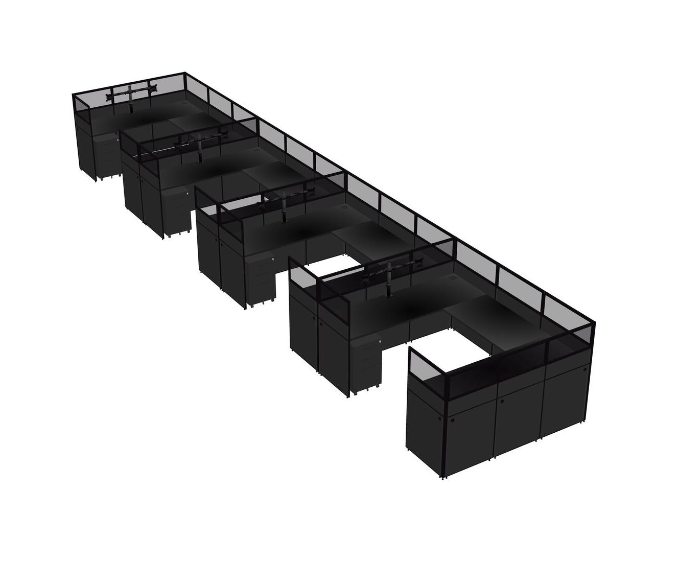 Black U-shaped Panel System For 4 Person + Monitor Arm (double Arms) + Metal Mobile Drawers For 4 User(s)