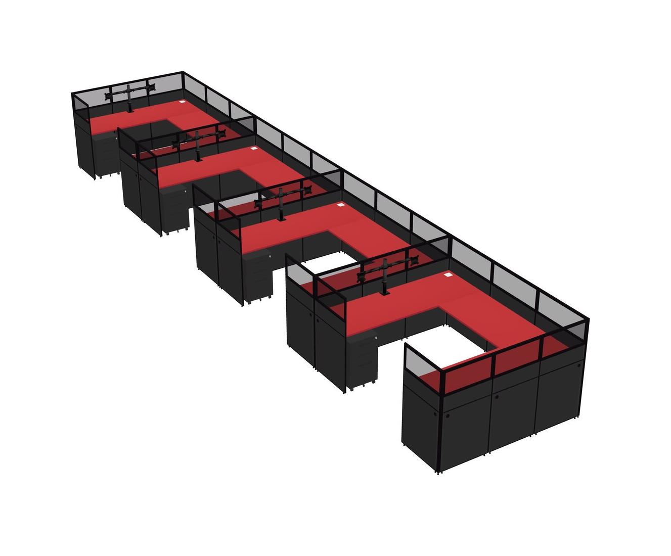 Prism Red U-shaped Panel System For 4 Person + Monitor Arm (double Arms) + Metal Mobile Drawers For 4 User(s)