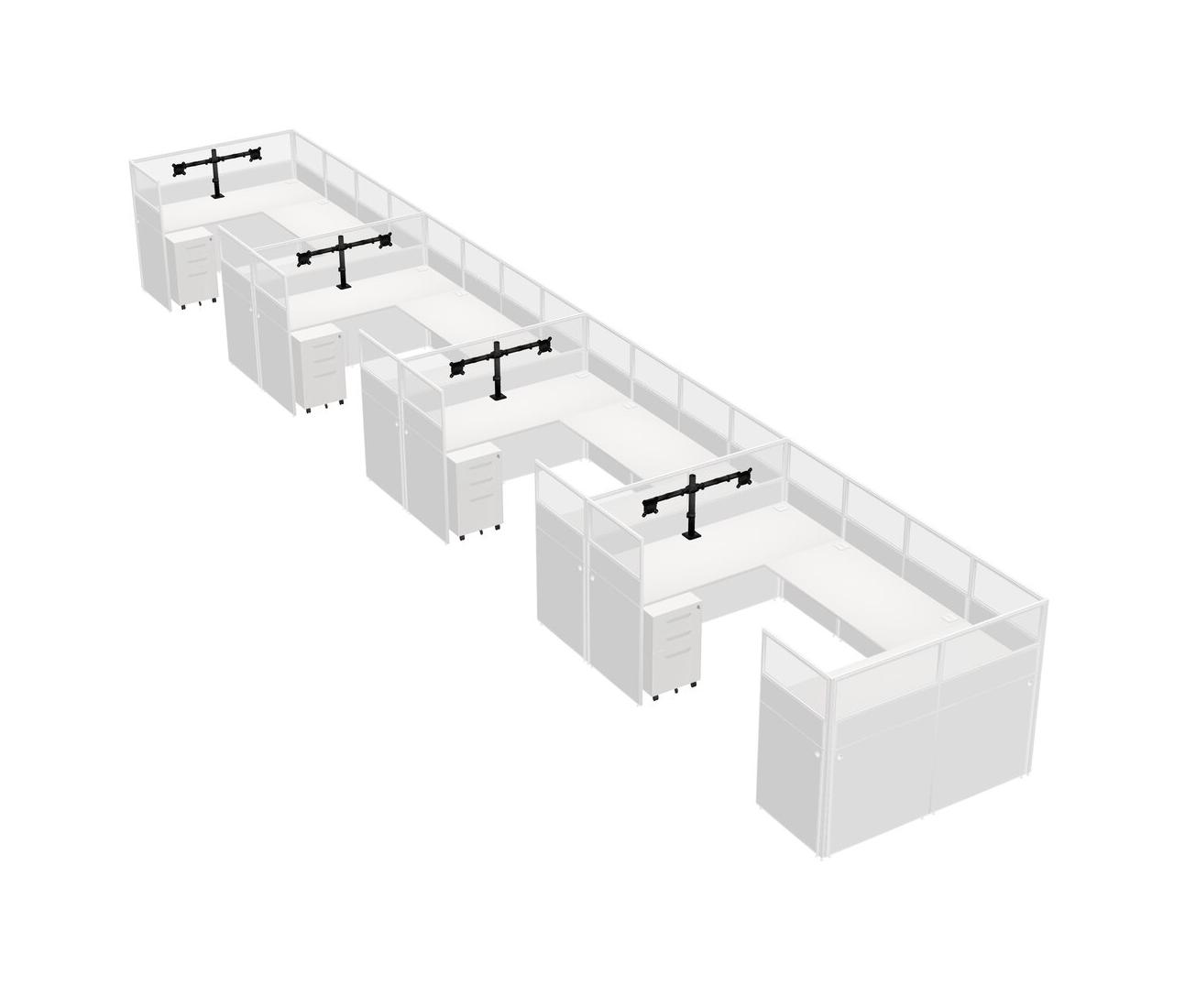 White U-shaped Panel System For 4 Person + Monitor Arm (double Arms) + Metal Mobile Drawers For 4 User(s)