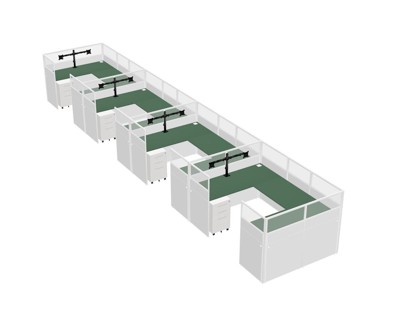 Green U-shaped Panel System For 4 Person + Monitor Arm (double Arms) + Metal Mobile Drawers For 4 User(s)