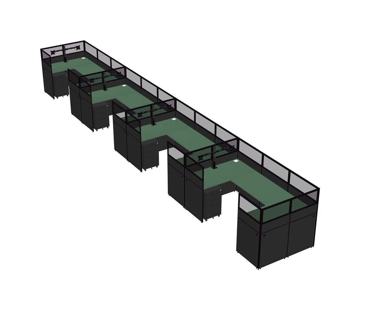 Green U-shaped Panel System For 4 Person + Monitor Arm (double Arms) + Metal Mobile Drawers For 4 User(s)