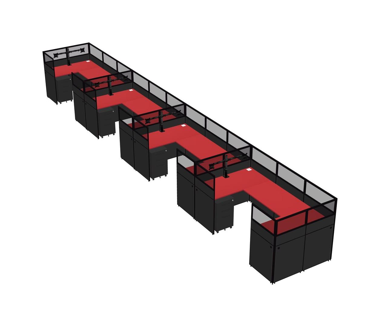 Prism Red U-shaped Panel System For 4 Person + Monitor Arm (double Arms) + Metal Mobile Drawers For 4 User(s)