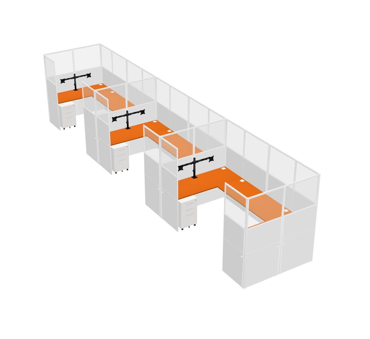 Orange U-shaped Panel System For 3 Person + Monitor Arm (double Arms) + Metal Mobile Drawers For 3 User(s)