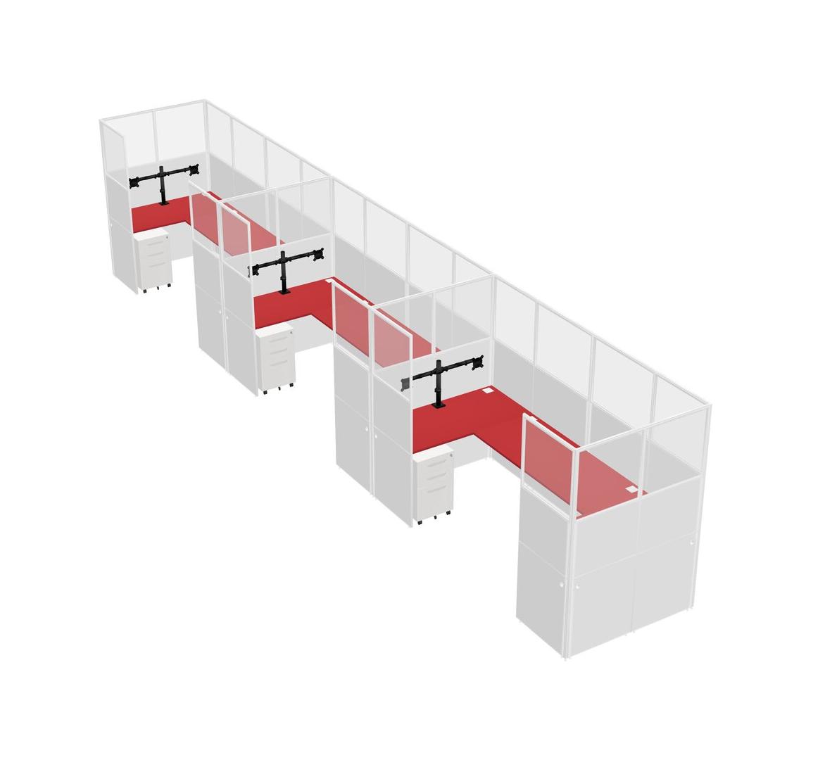 Prism Red U-shaped Panel System For 3 Person + Monitor Arm (double Arms) + Metal Mobile Drawers For 3 User(s)