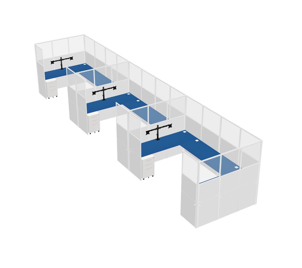 Prism Blue U-shaped Panel System For 3 Person + Monitor Arm (double Arms) + Metal Mobile Drawers For 3 User(s)