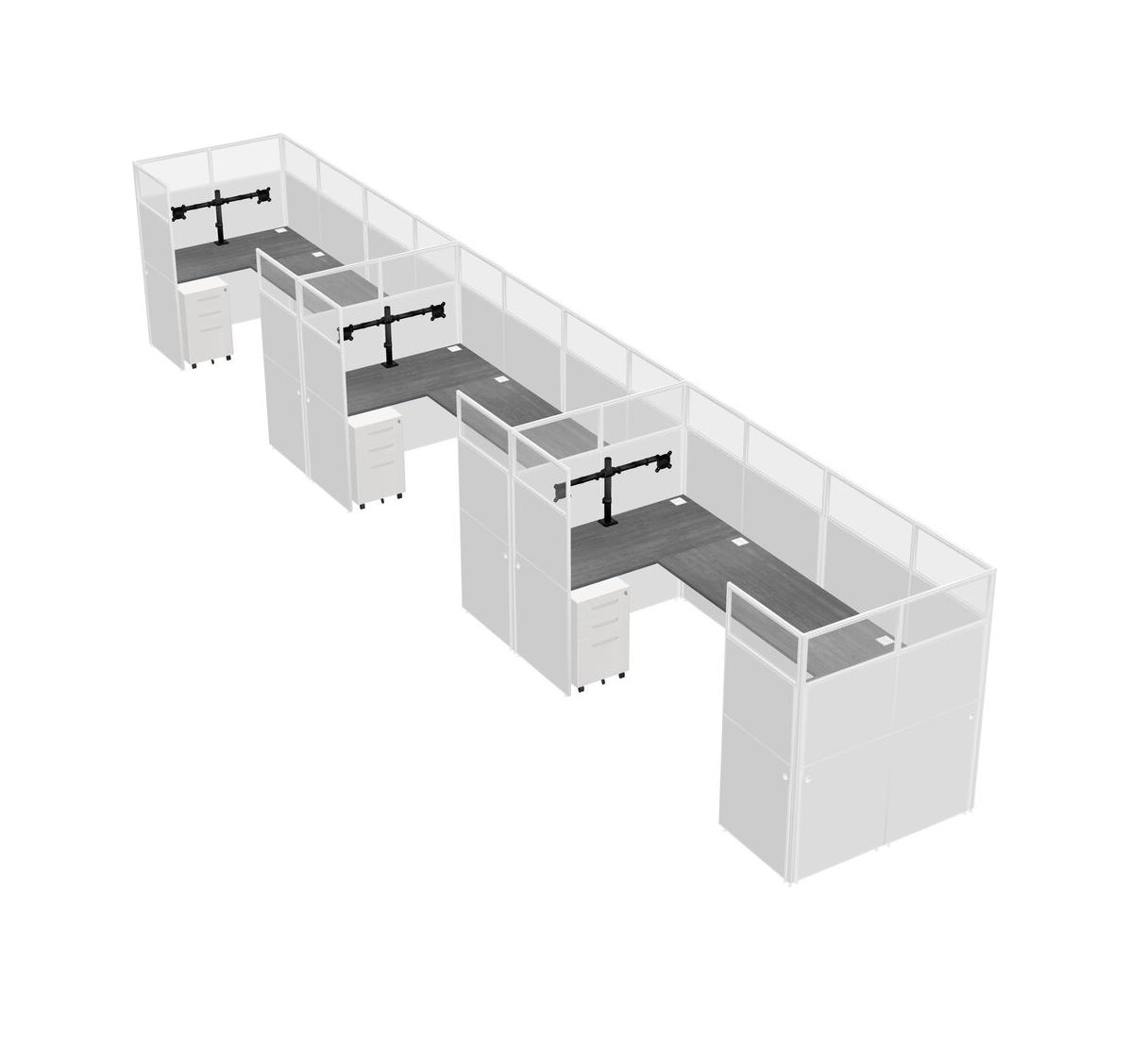 Grey U-shaped Panel System For 3 Person + Monitor Arm (double Arms) + Metal Mobile Drawers For 3 User(s)