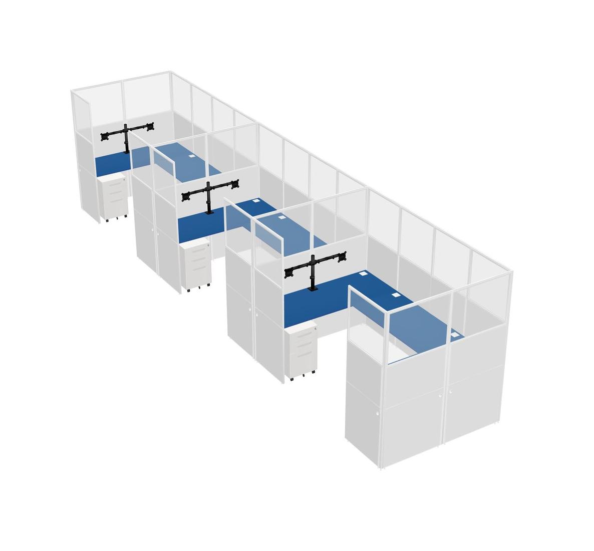 Prism Blue U-shaped Panel System For 3 Person + Monitor Arm (double Arms) + Metal Mobile Drawers For 3 User(s)